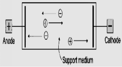 電泳緩沖液相對(duì)于固體支持物的移動(dòng)稱電滲。當(dāng)支持物不是絕對(duì)惰性物質(zhì)時(shí),常會(huì)因?yàn)橹С治锷洗嬖诘碾x子基團(tuán)如羧基、羥基等吸附電極溶液中的正離子,使靠近支持物的溶液層相對(duì)帶電,向負(fù)極移動(dòng),反之,若支持物的離子基團(tuán)吸附溶液中的負(fù)離子,則溶液層向正極移動(dòng)。電滲作用會(huì)影響顆粒的泳動(dòng)度,因此,在電泳時(shí),電滲小些為好。